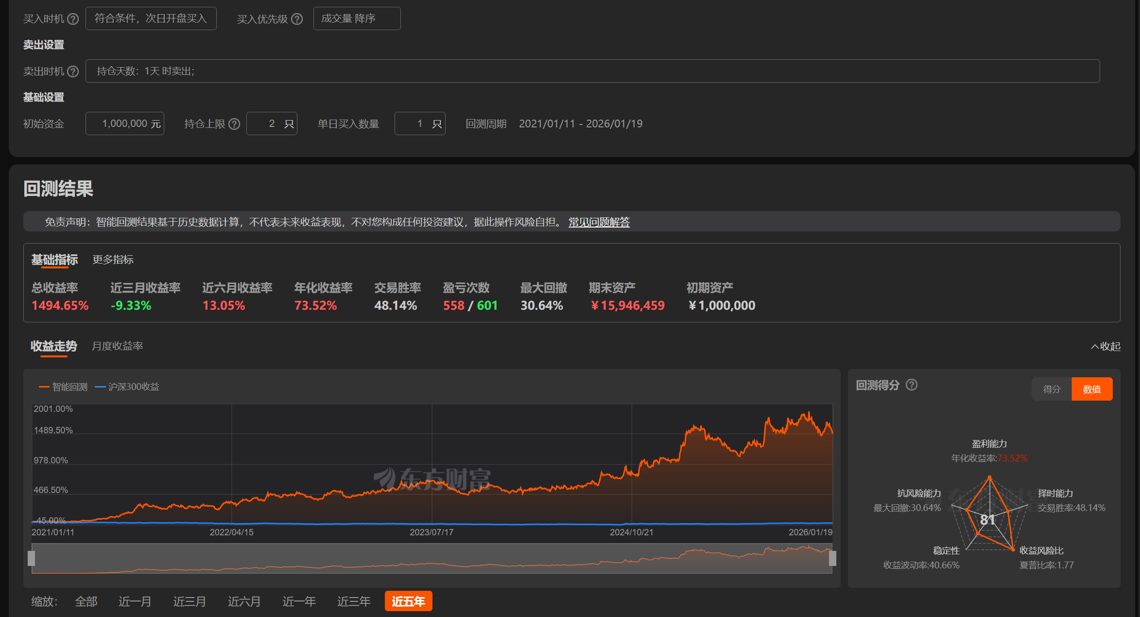 注:策略是基于东方财富历史数据回测出来的结果,不保证100%盈利,股市有风险,入市需谨慎!